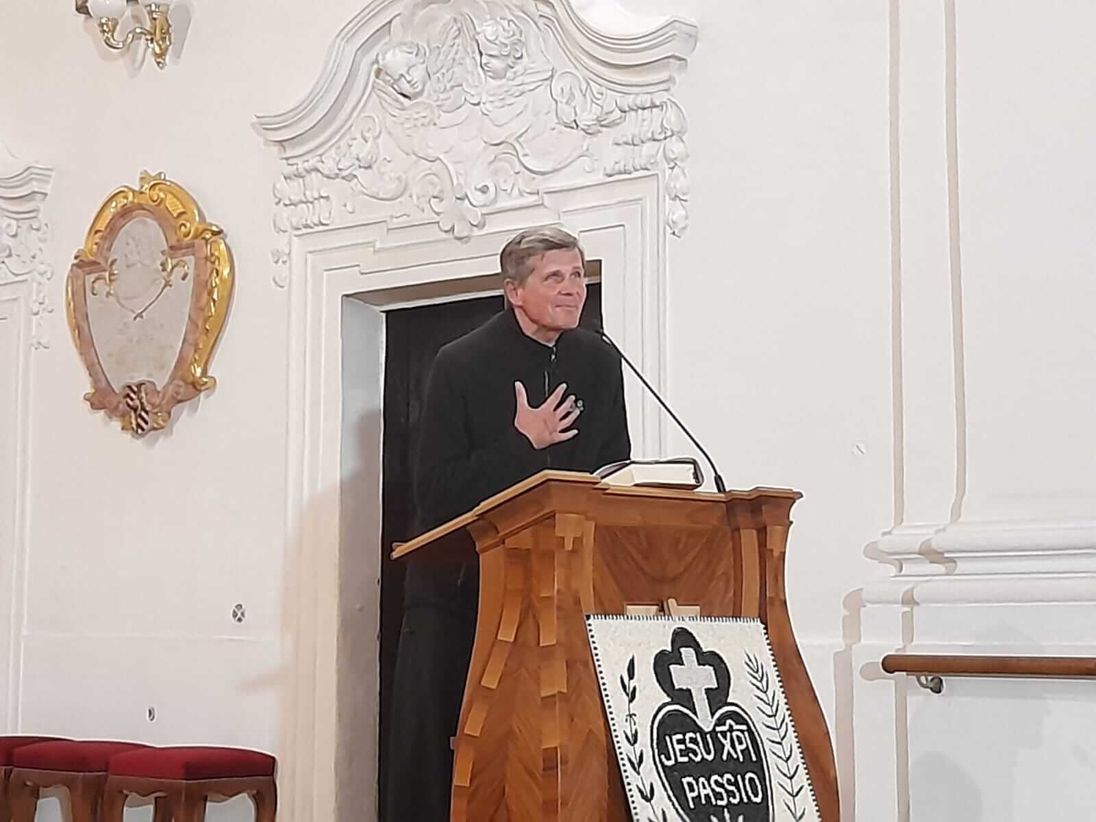 Br. Gabriel Hüger von der Gemeinschaft der Brüder Samariter FLUHM (Flamme der Liebe des Unbefleckten Herzens Mariens) erzählte beim Berufungsabend im Oktober von seiner Berufung zum Priester und der Berufung in seine Gemeinschaft. Die Wallfahrtskirche von Maria Schutz war gut gefüllt. Viele kennen Br. Gabriel und sind seinem segensreichen priesterlichen Dienst sehr dankbar. Auch ein Novize der Brüder Samariter FLUHM war dabei und begleitete Br. Gabriel.