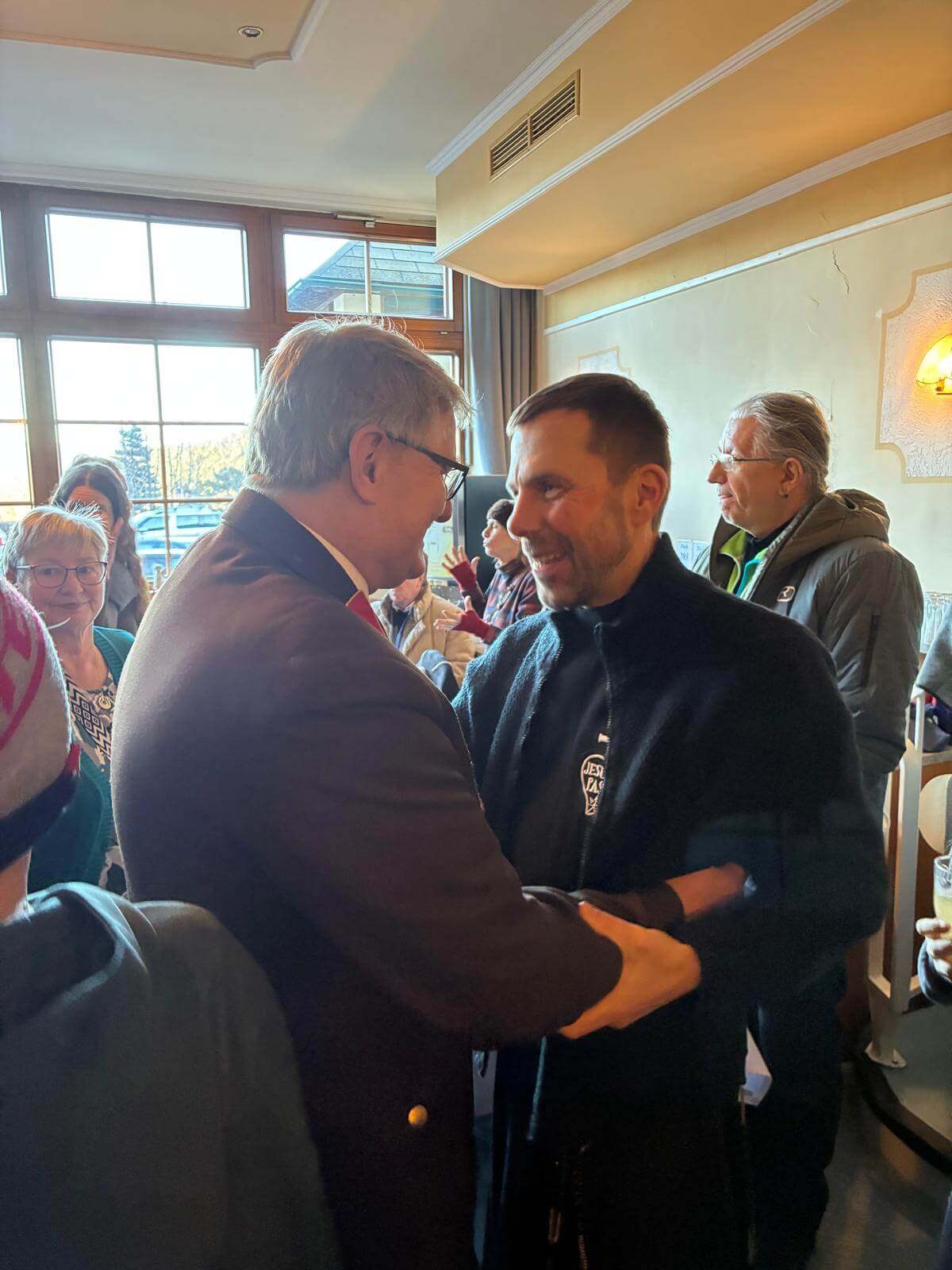 Im Anschluss an die hl. Messe traf man zu einer Agape im „Kirchenwirt“ zusammen, wo die Gelegenheit bestand, sich bei P. Markus zu verabschieden. P. Markus‘ Wirken wurde in den Reden verschiedener Mitglieder der Maria Schutzer Familie gewürdigt. Alle Redner hoben sein Dasein für die Menschen hervor, die in Maria Schutz Trost, Heil und Segen suchten, ebenso wie sein vorbildliches Gebetsleben. P. Markus selbst machte schließlich keinen Hehl daraus, wie schwer ihm der Abschied nach nunmehr 10 Jahren segensreichen Wirkens in Maria Schutz falle. Aber er blicke auch voller Dankbarkeit zurück und mit Vertrauen nach vorne, auf seine künftige Wirkungsstätte Eichstätt. Er werde Maria Schutz stets im Herzen tragen und im Gebet immer wieder auch vor den Herrn.