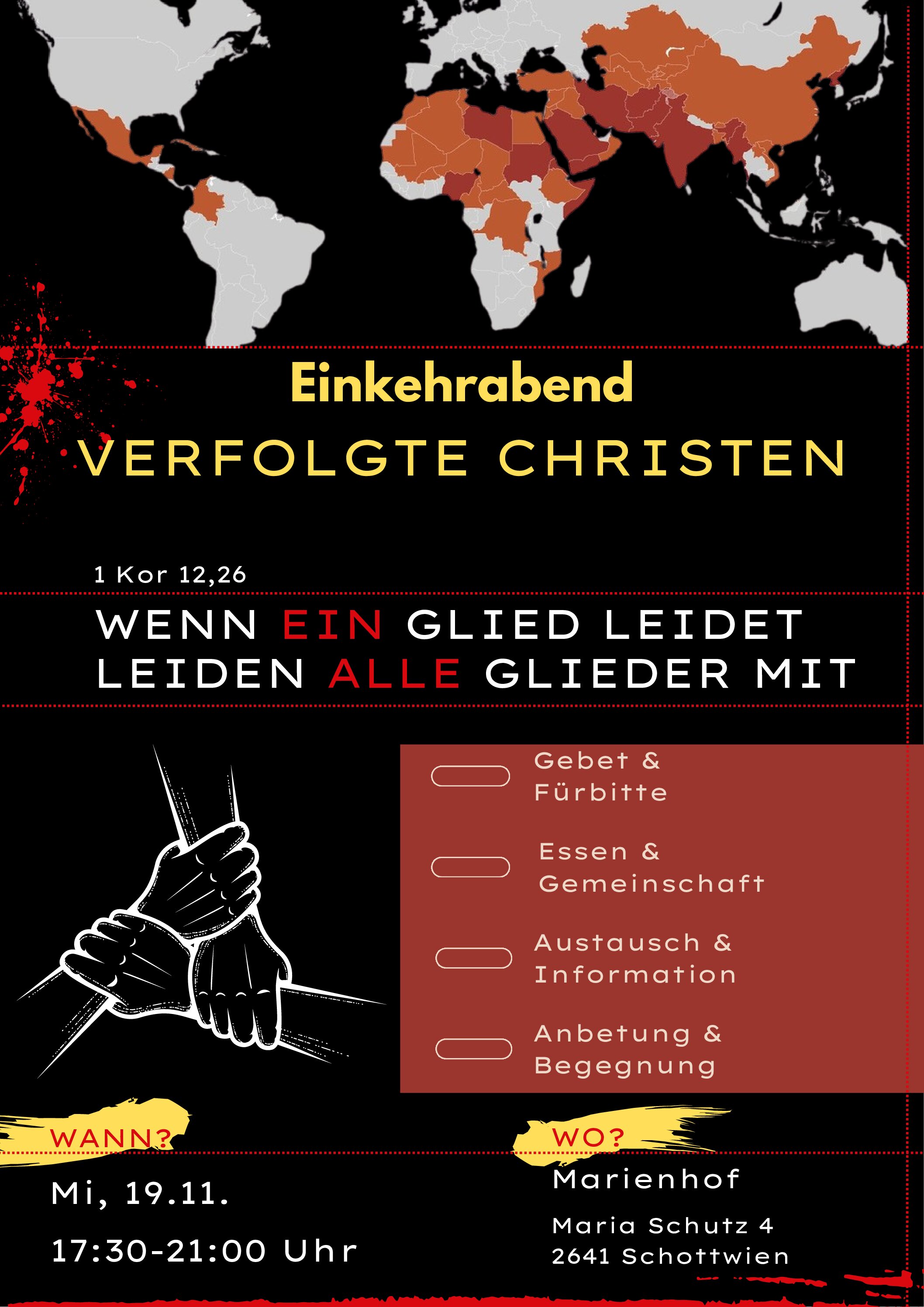 "Wenn ein Glied leidet, leiden alle Glieder mit." (1. Kor 12,26) So schreibt der Apostel Paulus an die Gemeinde in Korinth. Es ist daher nicht egal, wenn irgendwo auf der Welt ein Christ um seines Bekenntnisses für Jesus benachteiligt, gefoltert oder gar getötet wird. Wir wollen uns diesem wichtigen Thema - für das uns der Red-Wednesday sensibilisieren will - mit gemeinsamem Essen, Austausch, Gebet und Anbetung nähern. Herzliche Einladung!! |