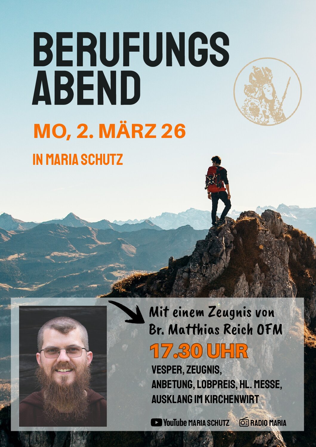 Veni Creator Spiritus und Berufungsgebet Ab 17:30 Uhr: Vesper, Zeugnis und Anbetung 19:00 Uhr: Hl. Messe