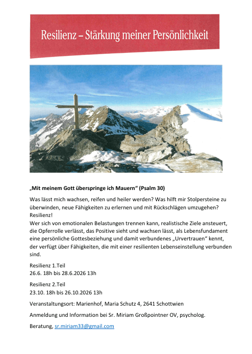 P. Maximilian Plöchl ORC (Kreuzorden) Thema: “Einer trage des anderen Last” Beginn: Freitag, 18 Uhr Ende: Sonntag, 14 Uhr Kursbeitrag: 50 € Übernachtung (VP) DZ: 165,- €, EZ: 195,- €, Anmeldung bis 13.02. im Sekretariat: +43 2663 8208 / sekretariat@mariaschutz.at